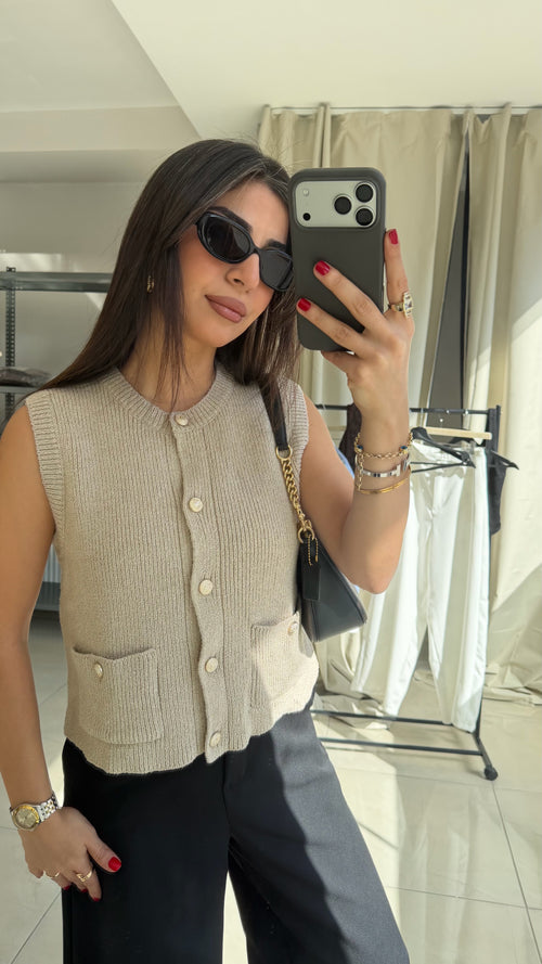 Bej Triko Düğmeli Yelek